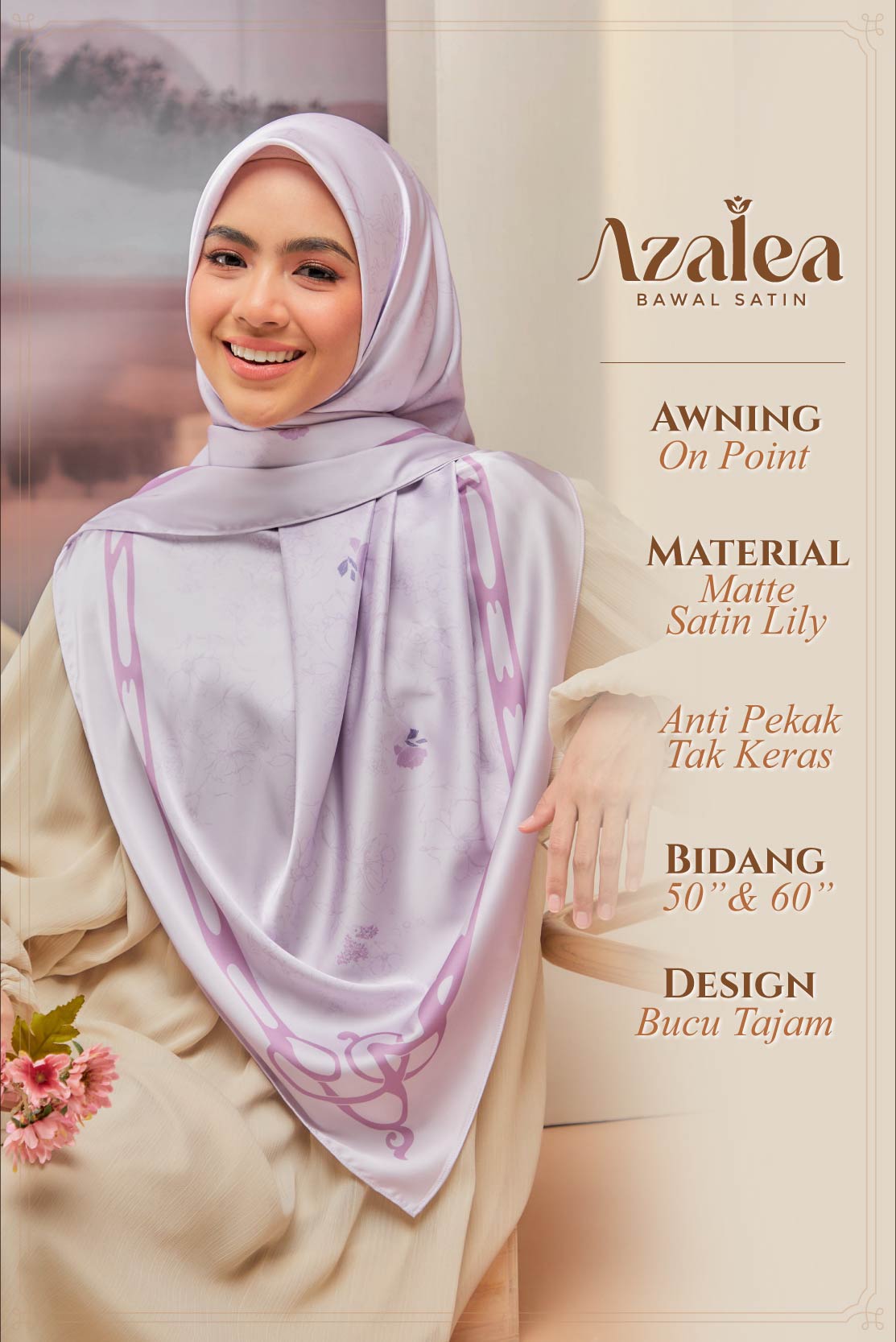 ➨ Material : Matte Satin Lily (senang terbentuk di muka & anti-pekak)
