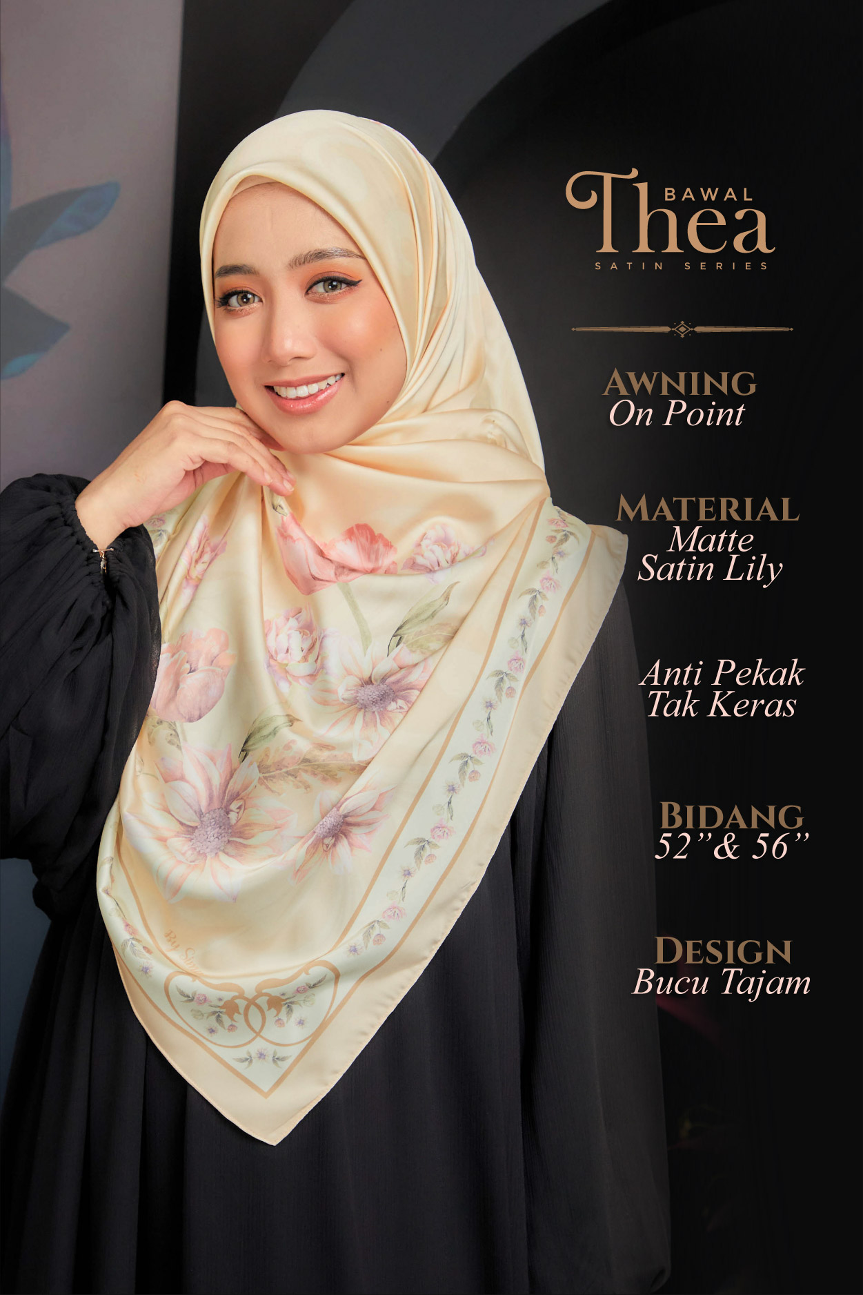 ➨ Material : Matte Satin Lily (senang terbentuk di muka & anti-pekak)