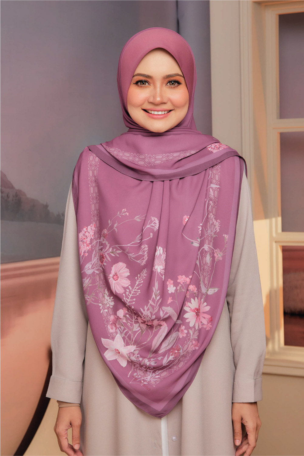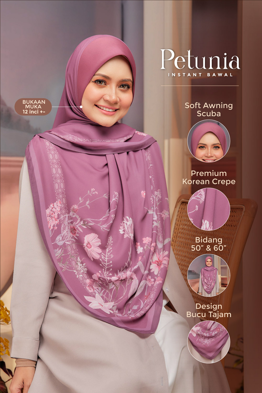 ** Model is 161 cm tall and wearing Instant Bawal Petunia (bidang 60″)
